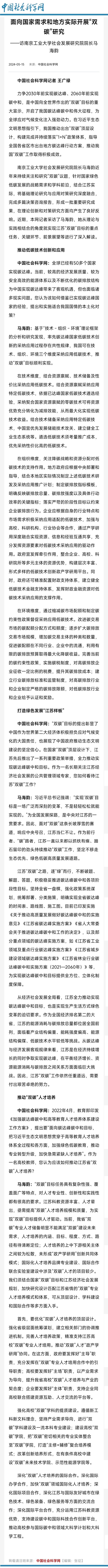 面向国家需求和地方实际开展“双碳”研究 ——访南京工业大学社会发展研究院院长马海韵